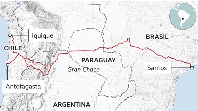 El corredor bioceánico es un trazado internacional de más de 3.400 kilómetros que busca unir el centro-oeste de Brasil con el Chaco paraguayo, las provincias argentinas de Salta y Jujuy, y los puertos del norte de Chile: Antofagasta, Mejillones e Iquique, sobre el océano Pacífico.