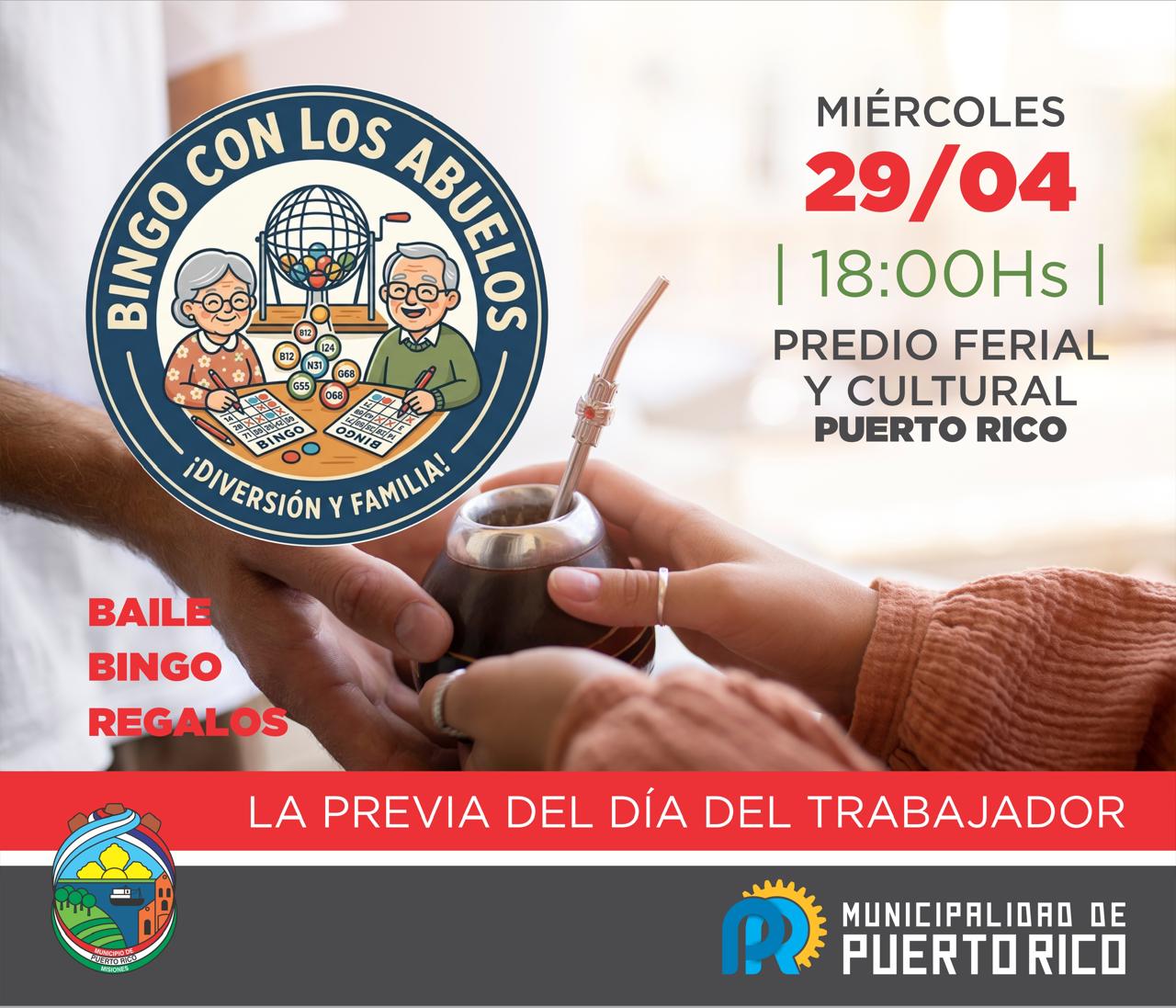 El próximo miércoles 29 de abril a partir de las 18,00 horas se realizará en el Predio Ferial y Cultural de Puerto Rico una jornada de “Bingo con los abuelos” con baile, bingo y regalos.