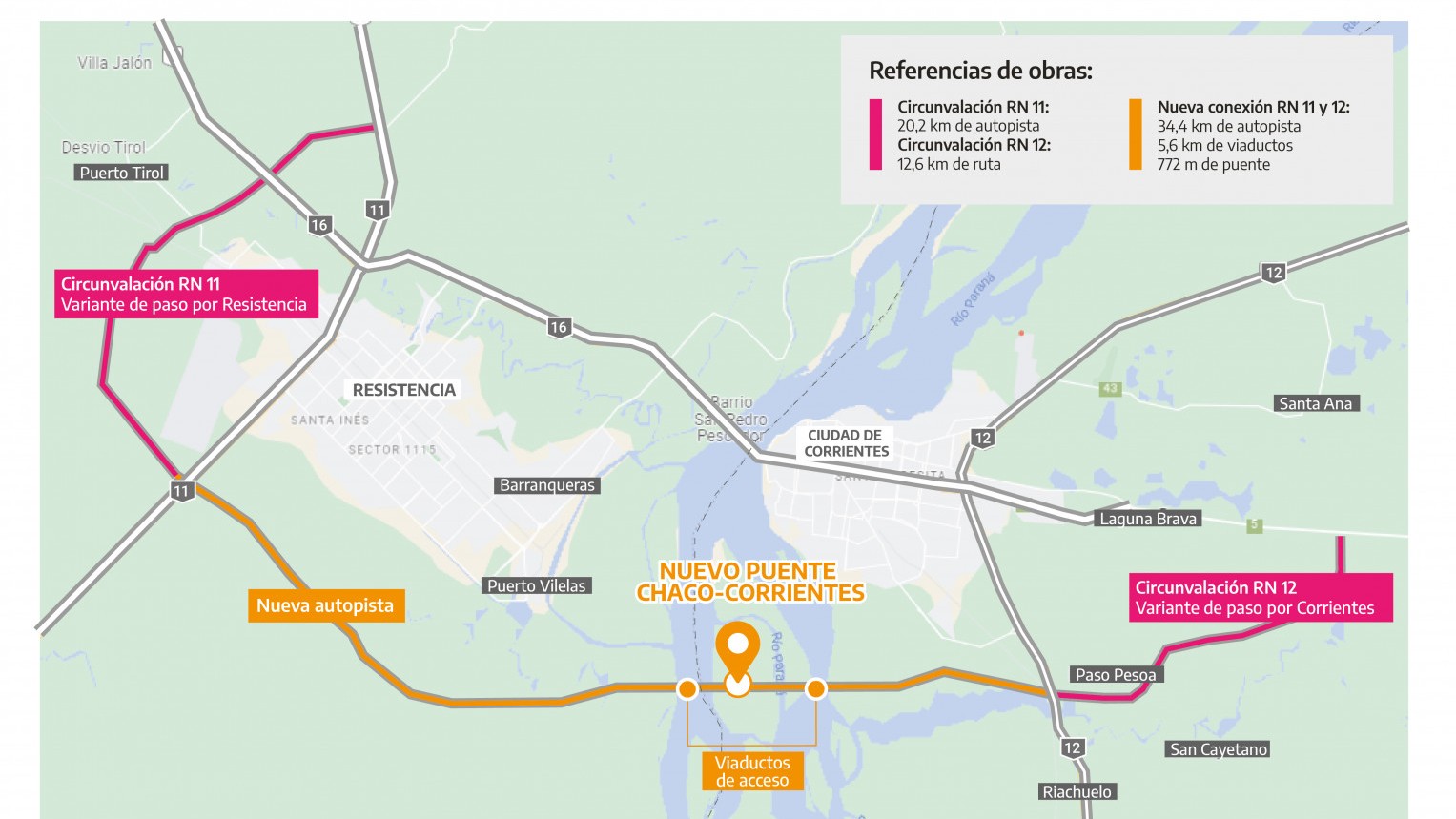 El Segundo Puente Chaco-Corrientes, incluirá un puente principal de 772 metros, 34,5 km de autopista y variantes de conexión con las RN 11, 12 y 16., conectará el área de Santa Catalina en Corrientes con la zona de la Ruta Nacional 16 en Resistencia, Chaco.