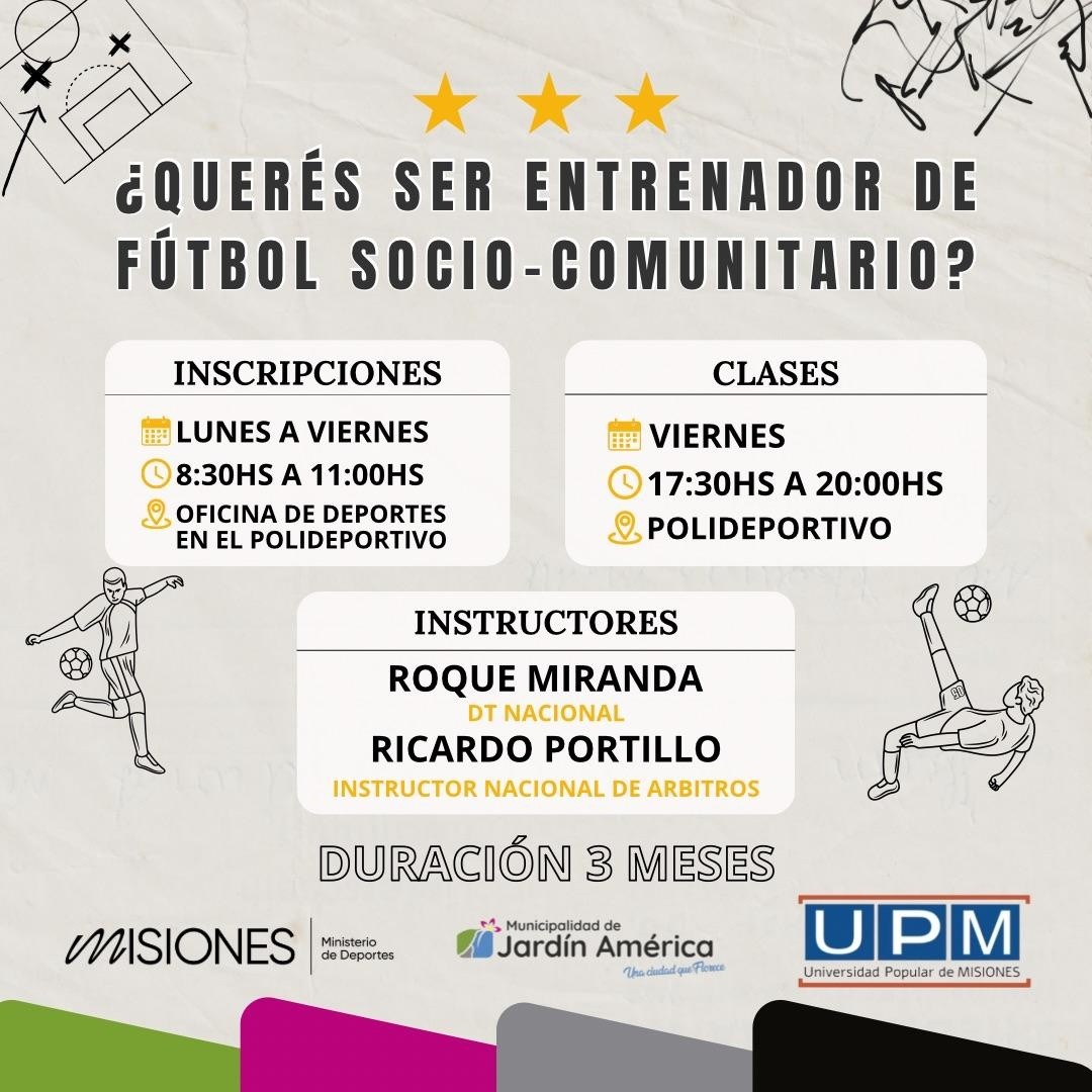 El próximo 17 de abril comenzará a dictarse en Jardín América el curso de “Entrenador de futbol socio comunitario”, capacitación a cargo del DT Nacional Roque Miranda y del Instructor Nacional de Árbitros Ricardo Portillo.