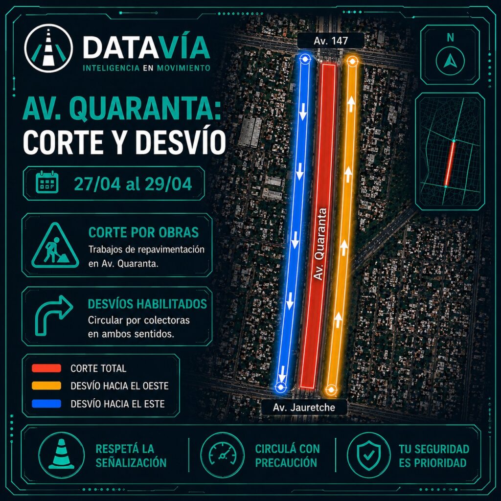 A partir de mañana, lunes 27 y hasta el miércoles 29 de abril, la calzada principal de la Av. Quaranta estará cerrada al tránsito entre la Av. 147 y la Av. Jauretche. Todo el flujo vehicular se desviará por las colectoras.